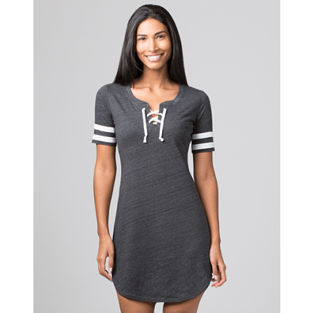When it comes to our fashionable All-Star Dress, maximum comfort and style come standard for everyday activities. Crafted from soft blends of polyester, cotton, rayon, and heather tri-blend jersey, this modish lace up V-neck dress relaxes nicely against the feminine shape without sacrificing a casual comfy fit! It features trendy self-contrasting sleeve stripes and a sophisticated braided drawcord made from one hundred percent cotton. The All-Star Dress is a top choice for casual and ultra-comfort.